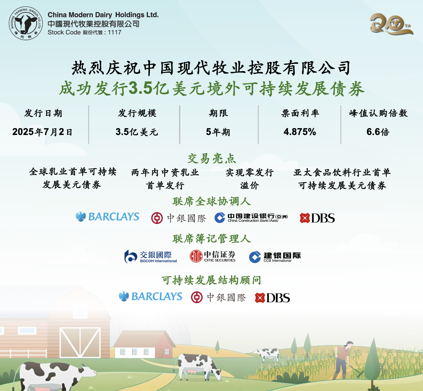 現(xiàn)代牧業(yè)(集團)有限公司(簡稱“現(xiàn)代牧業(yè)”)2005年在安徽省馬鞍山市成立,2010年在香港聯(lián)交所上市。作為中國奶牛養(yǎng)殖業(yè)領(lǐng)軍企業(yè),現(xiàn)代牧業(yè)依托數(shù)智創(chuàng)新構(gòu)建“從一粒種到一杯奶”全產(chǎn)業(yè)鏈,與戰(zhàn)略股東蒙牛集團強強聯(lián)合,實現(xiàn)協(xié)同共贏。